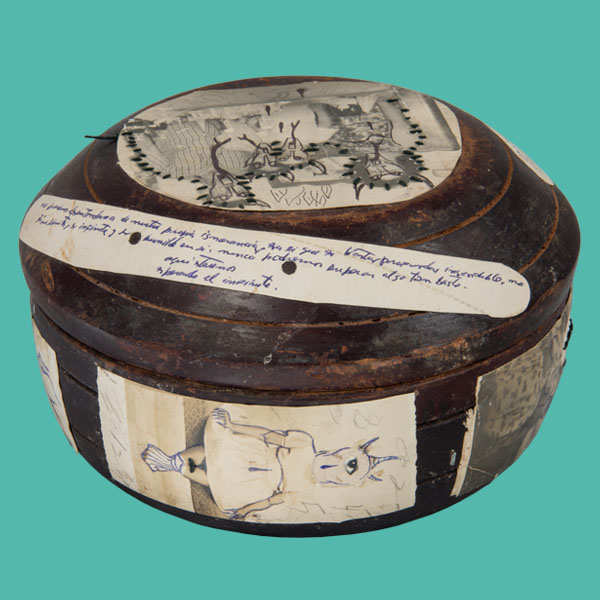 nizable in that often depict body-builders in briefs and the artist uses numerous strips of tan tape to hold the images in place. Hernández,on the other hand, meticulously cuts out heads and eyes from black-and-white photographs. He creates curio boxes that include these pasted images on the covers or tucked away inside. Sometimes he stitches thread around these images or draws a companion image, such as a shadow, devil horns or forked tongues.